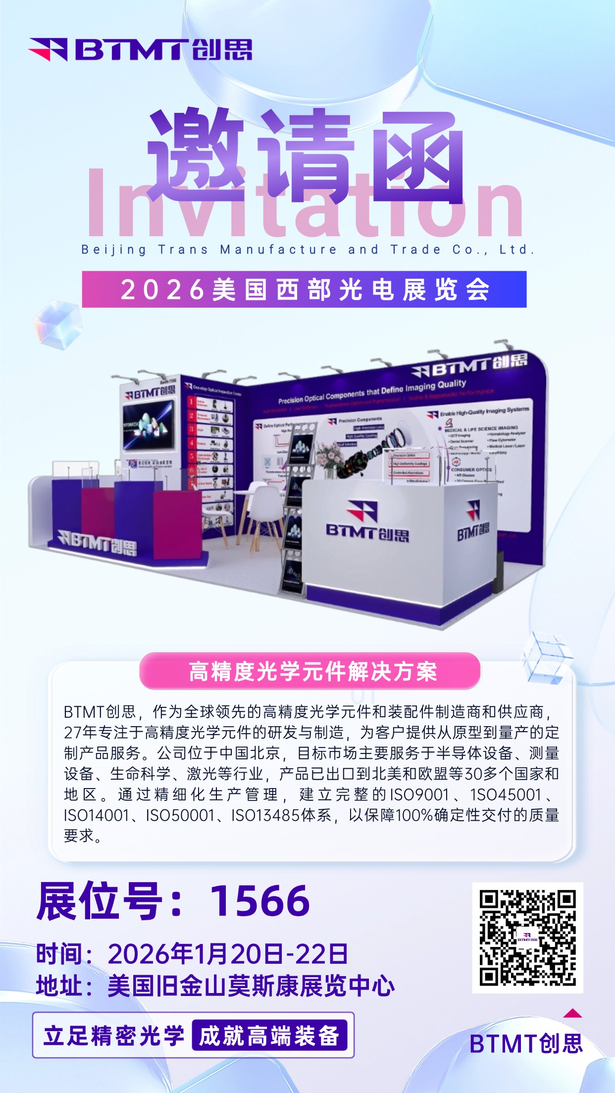 2026年1月20日至22日,北京创思工贸有限公司(BTMT创思)将赴约美国2026 SPIE西部光电展览会,创思展位号:1566,诚邀您莅临展位!